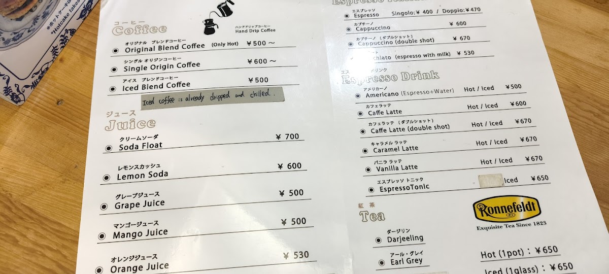 Visitors often come for a carefully brewed drip coffee or a rich espresso doppio, perfect choices to savor on their own or paired with a soft, fluffy pancake. Refreshing options like the イチゴミルクスムージー add a gentle sweetness, especially welcome when the weather calls for something cool.